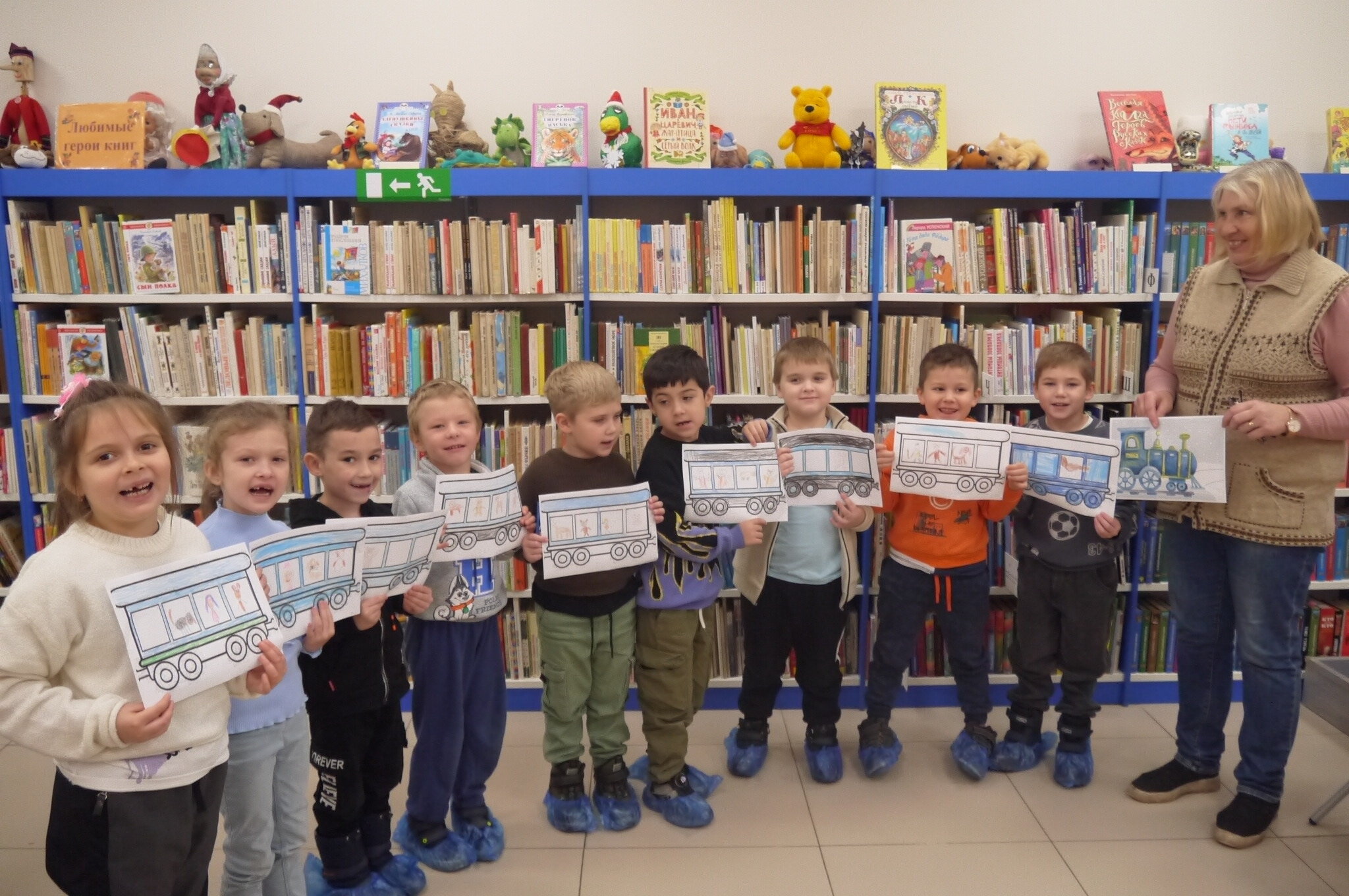 Ребята нарисовали персонажей сказки в вагончиках волшебного поезда «Голубая Стрела». В завершение мероприятия все вагончики с рисунками соединились в один длинный разноцветный поезд.