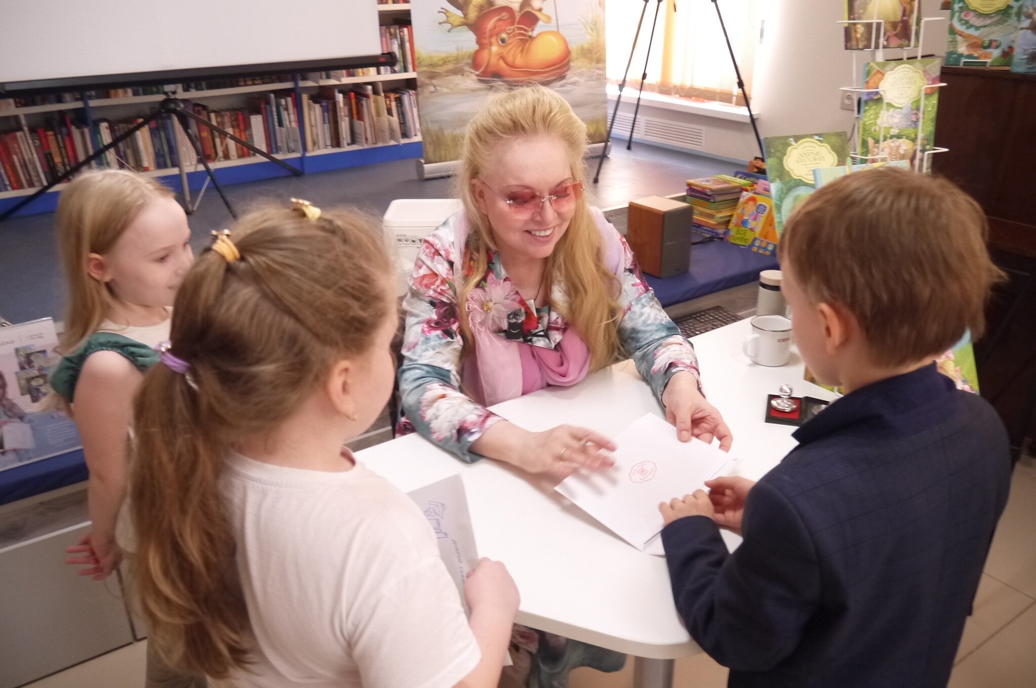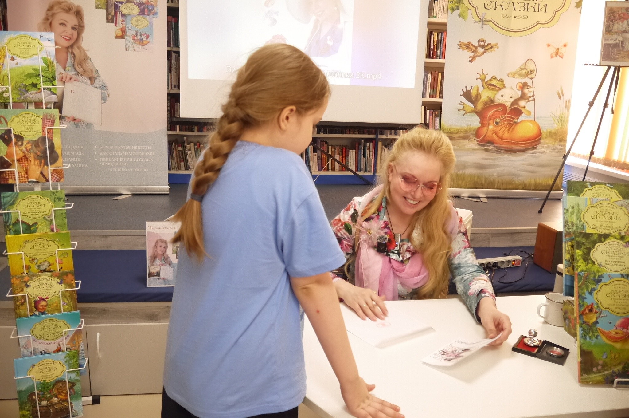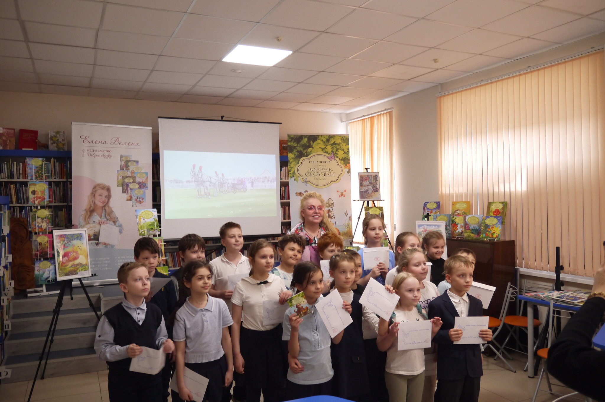 3 апреля, в рамках Всероссийской недели детской книги, в гостях в Центральной детской библиотеке побывала Елена Велена - лауреат международной премии П.П.Ершова и член Союза писателей России. На встречу с "Добрыми сказками" Елены Велены были приглашены школьники МБОУ СОШ №11. Юные читатели окунулись в волшебный мир чудесных историй детской писательницы, рассмотрели уникальную коллекцию шляпок ручной работы. Особенно ребятам понравился мастер-класс по изготовлению удивительной открытки с печатью и автографом Елены Велены и подарок - мини-книжка "Добрых сказок". В детской библиотеке размещена выставка иллюстраций, посвященная книгам автора - "Полет соломенной шляпки" и "Королевские скачки". Выражаем искреннюю благодарность Елене Велене и организаторам мероприятия за эту волшебную встречу!