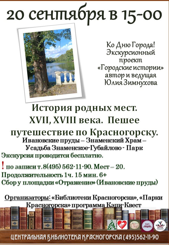 👉Автор и ведущая Юлия Зимнухова. 💢Пешее путешествие по Красногорску "История родных мест 17, 18 века. 📍Сбор у площадки "Отражение" (Ивановские пруды) ➡️ Знаменский храм➡️ Усадьба Знаменское-Губайлово ➡️ Парк 📌По записи 8(495) 562-11-90