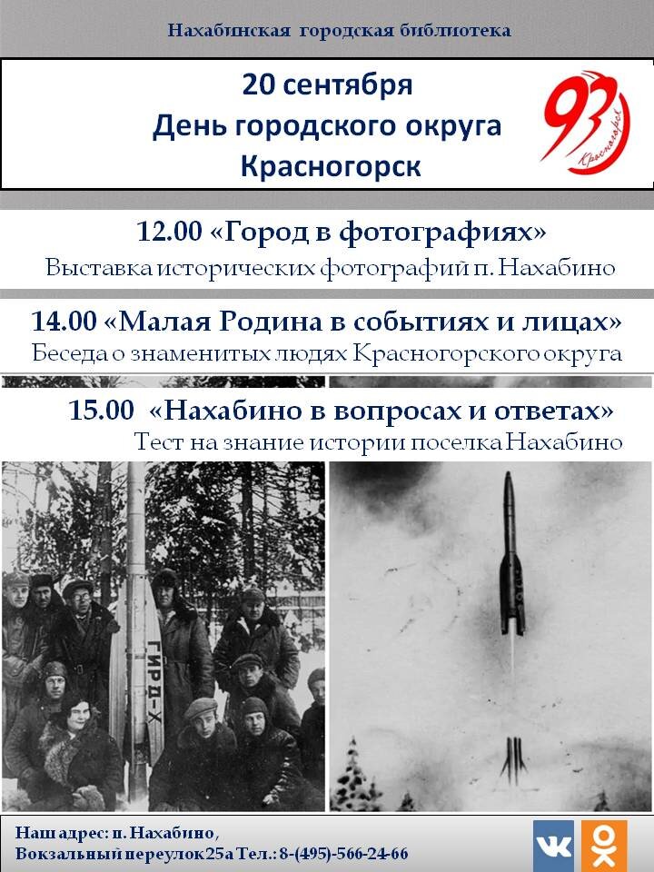 Дорогие друзья! 20 сентября в День городского округа Красногорск приглашаем всех желающих в Нахабинскую городскую 📚библиотеку.
