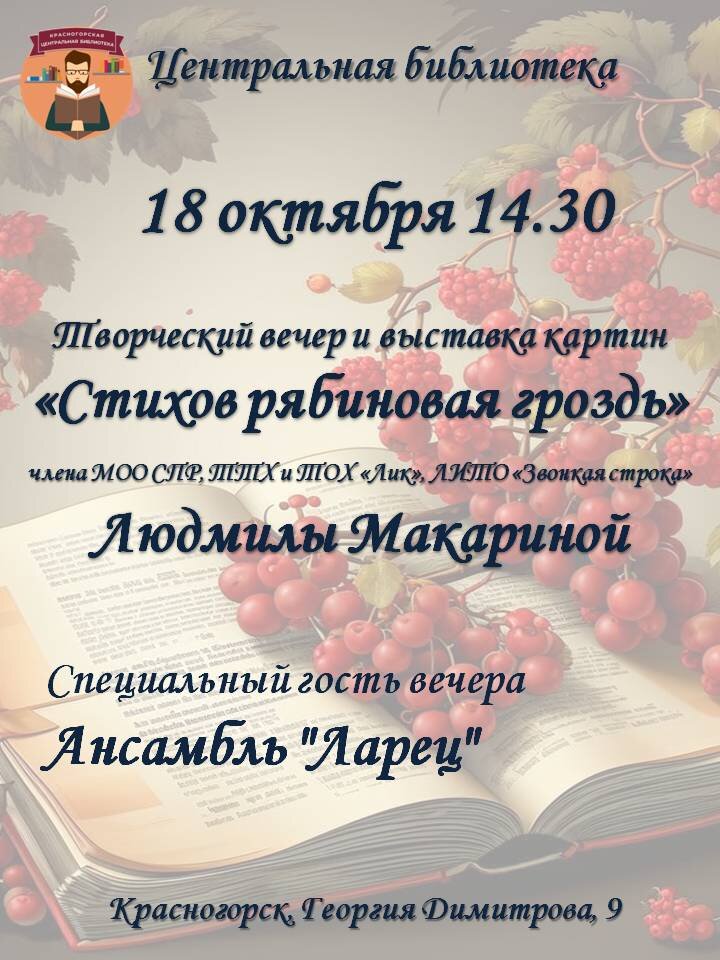 Друзья! Приглашаем вас на особенное мероприятие — творческую встречу с Людмилой Макариной, членом МОО Союза писателей России, ЛИТО "Звонкая строка", объединений художников ТТХ и ТОХ "ЛИК", и выставку её картин «Стихов рябиновая гроздь».