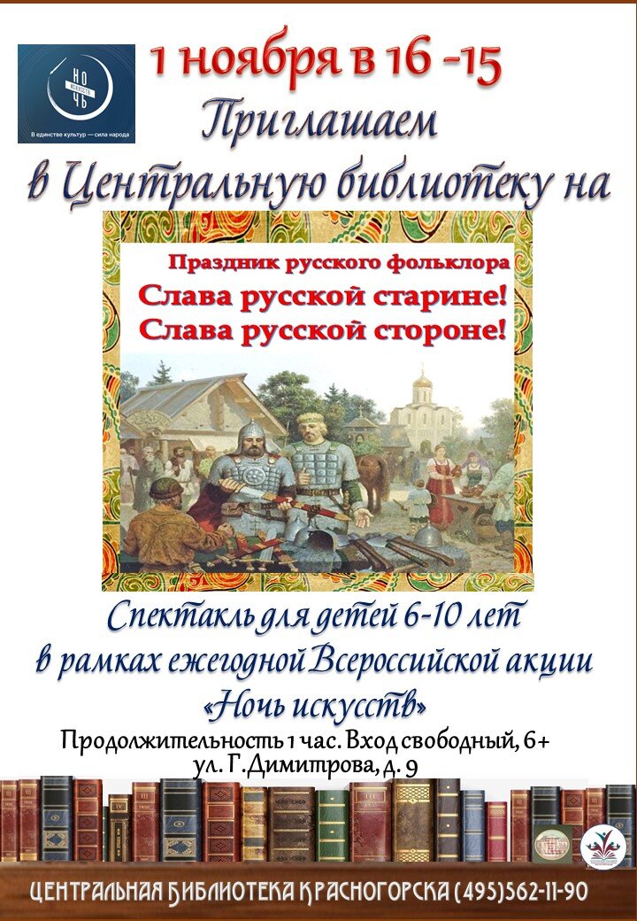 Центральная библиотека и программа «Кэпи-Квест» 1 ноября в 16.15 приглашают юных читателей на волшебный спектакль «Слава русской старине, Слава русской стороне!»