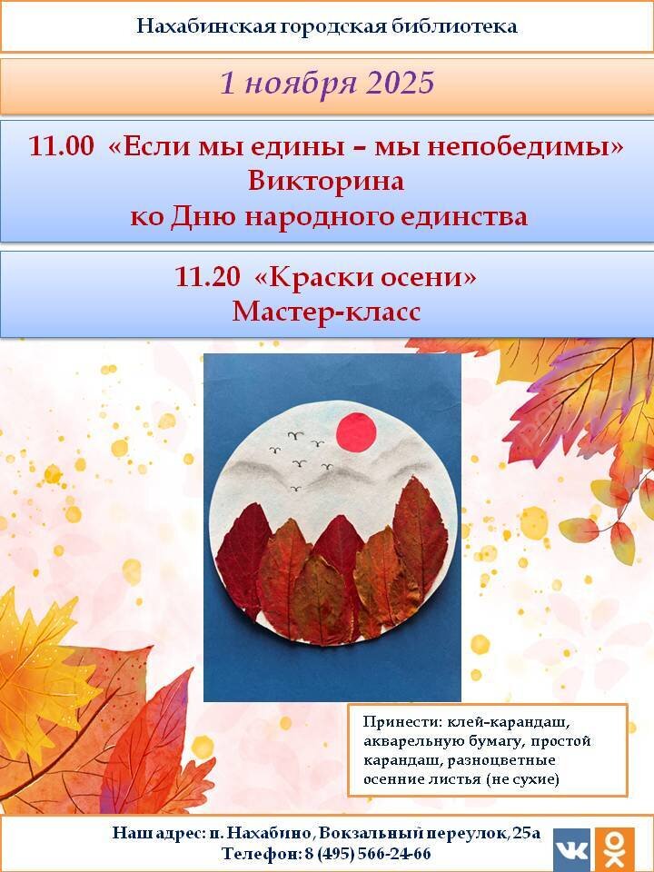 1 ноября Нахабинская городская библиотека приглашает в 11.00 на познавательную викторину «Если мы едины – мы непобедимы» и в 11.20 на мастер-класс «Краски осени».