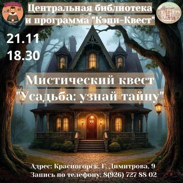 Любители таинственных историй могут попасть на мистический квест! 21 ноября осенним вечером у вас будет уникальная возможность стать участником Квеста «Усадьба: узнай тайну...» в Центральной библиотеке! Всего 10 мест!