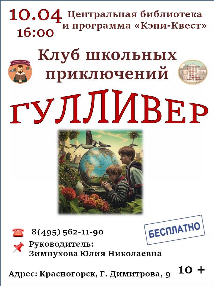 ✨Приглашаем 10 апреля в 16.00 подростков в клуб школьных приключений «Гулливер»!