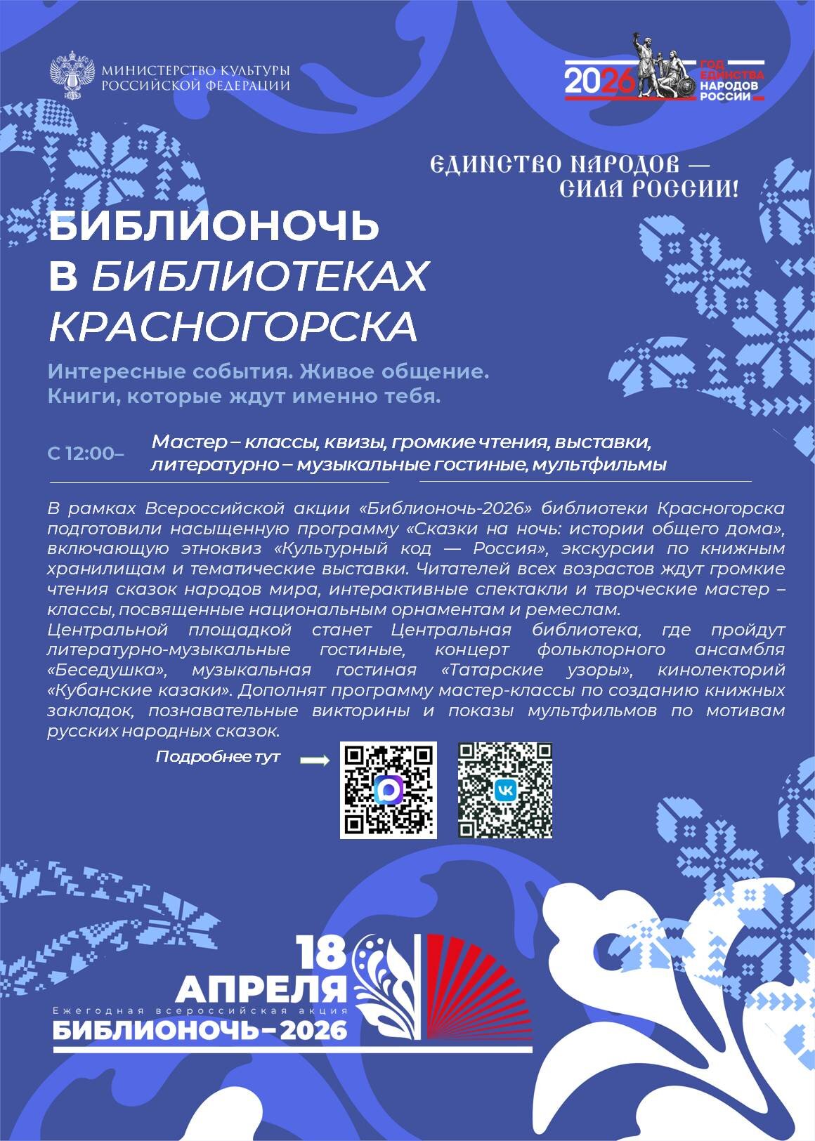 Друзья, 18 апреля библиотеки Красногорска превращаются в центры притяжения для всех, кто любит Россию, её сказки, традиции и уют. Ловите дайджест событий, чтобы ничего не пропустить!