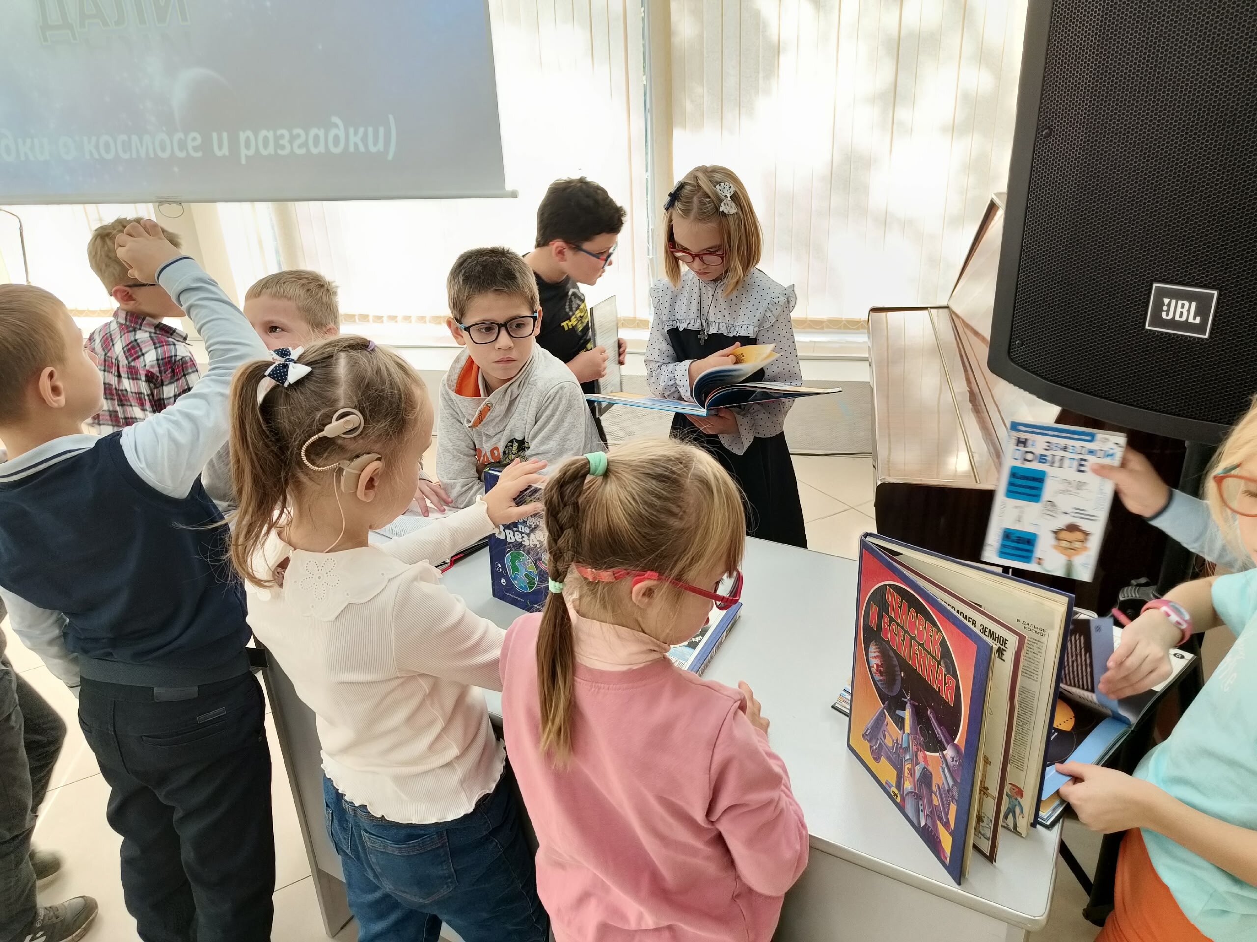 В Центральной библиотеке для учащихся 1 класса МБОУ «Начальная школа — детский сад» состоялась захватывающая интерактивная беседа «Космические загадки», посвящённая запуску первого спутника Земли.