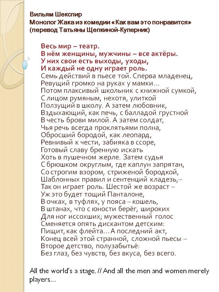 Остается добавить, что правнучке М.С Щепкина, Татьяне Львовне Щепкиной-Куперник (1874-1952 годы жизни), известной писательнице, поэтессе, заслуженному деятелю искусств РСФСР принадлежит один из вариантов перевода шекспировской комедии «Как вам это понравится», откуда и улетела в народ ставшая крылатой фраза.